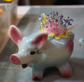 I love this little pig pin cushion my son gave me one year for Christmas. I collect pigs and sew so a perfect combination! I think it is made from a flower vase.