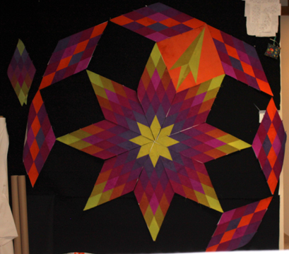 I am still working on my version of the Lone Star quilt that I started in Jan Krentz’s class FOR MYSELF, for my OWN bed and loving it. I am only making one panel a day because of all the other stuff I have going on, but it makes me still feel connected to the project and I am liking the colors and quilt so much it is hard not to do just it. See that smaller diamond on the left side, that was the original size of the pattern, I increased it so it would fit my KING size bed.