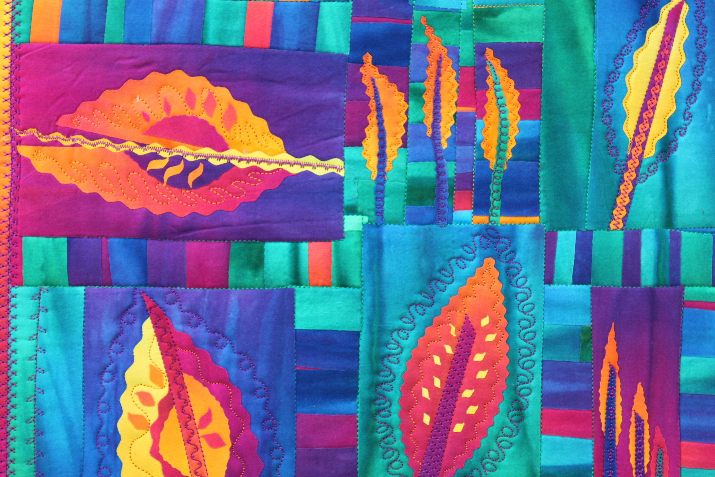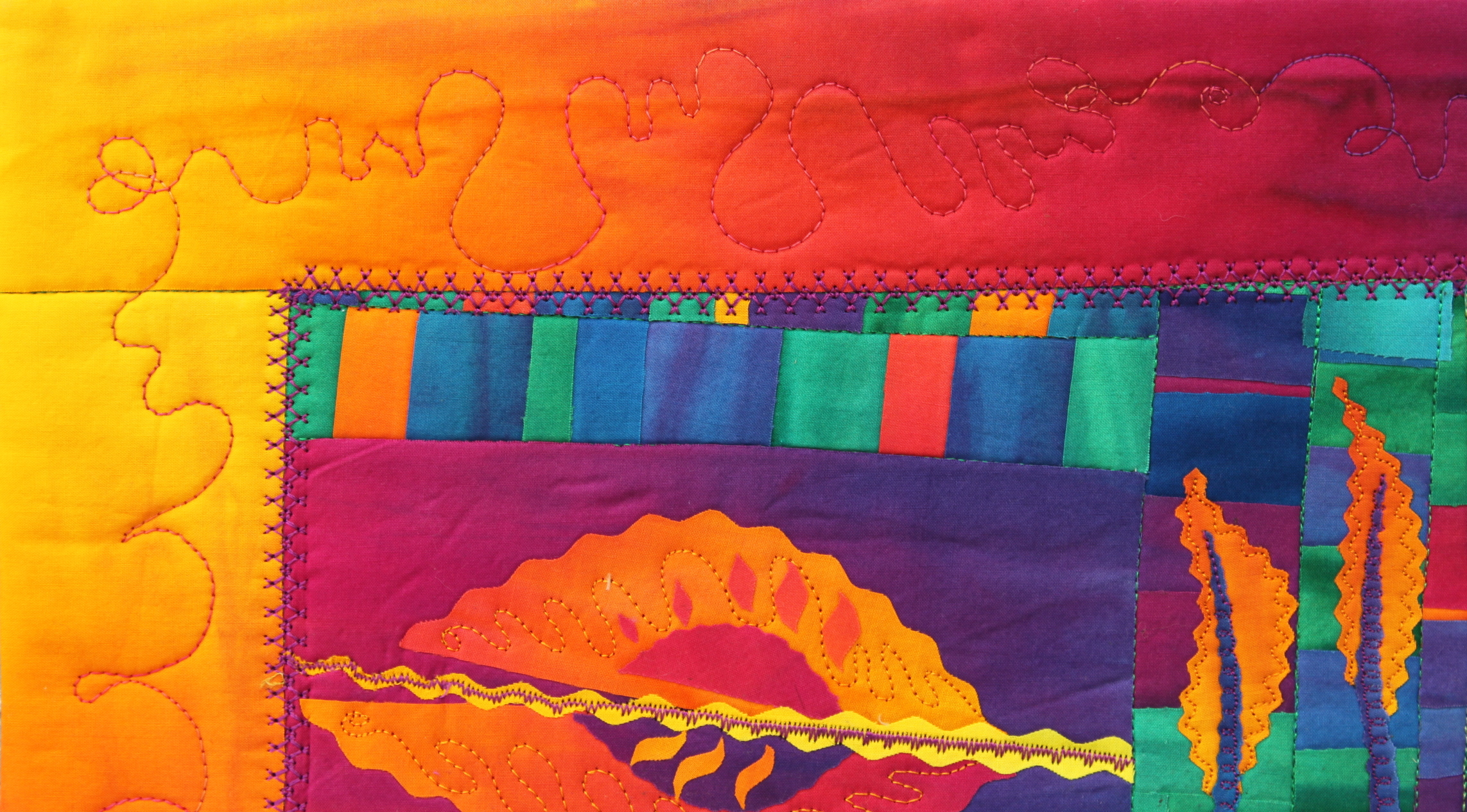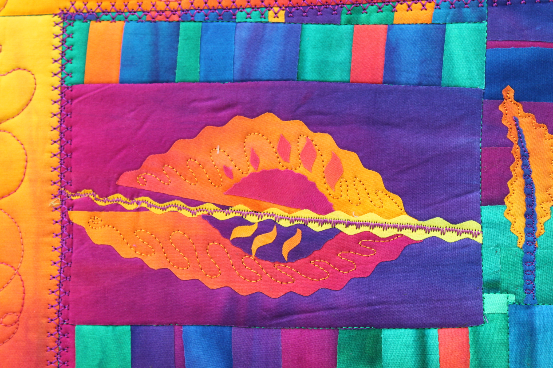 It is a fused collage “organic” quilt made with 1/2 yard of my Rainbow hand dyed fabric. Machine quilted and decorative stitches added for interest and detail.