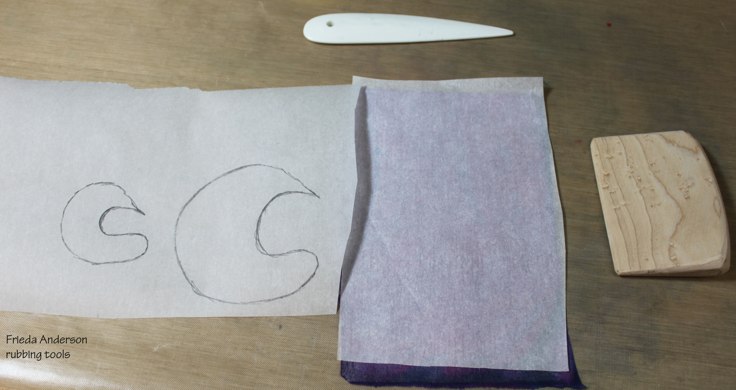 Then I place the “marked” side of the paper against the “fused” side of the fabric and I rub it with one of these tools.