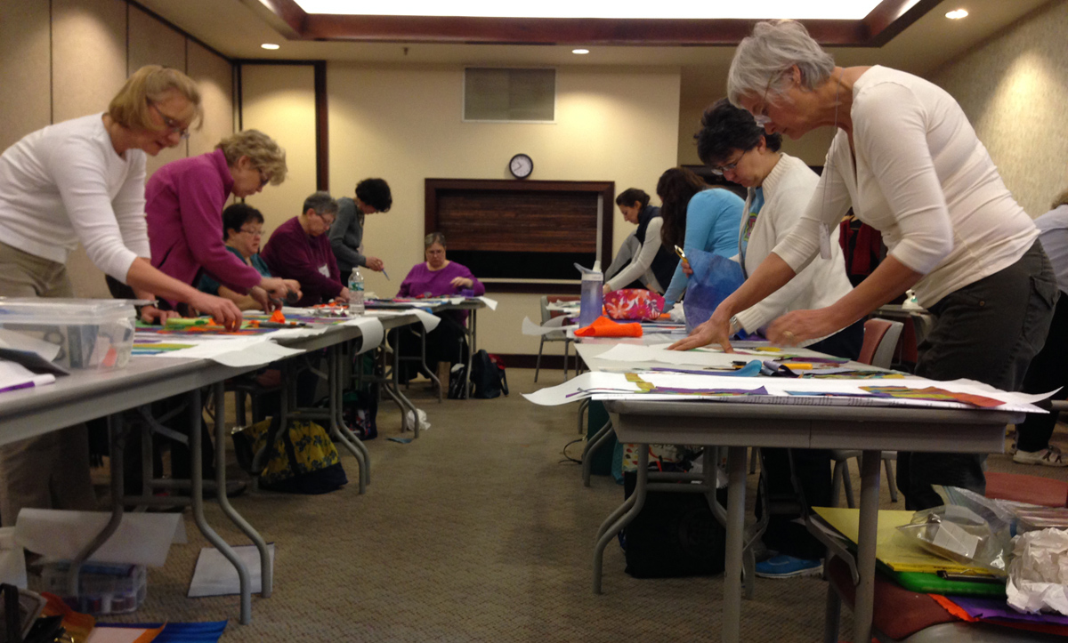 All they had to do at home was put on the borders and quilt their SunSet Pines. It should be up on the wall by now.