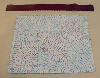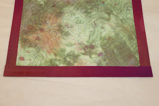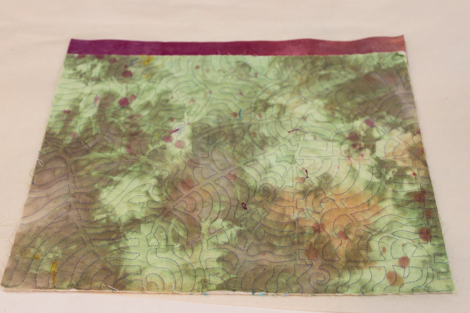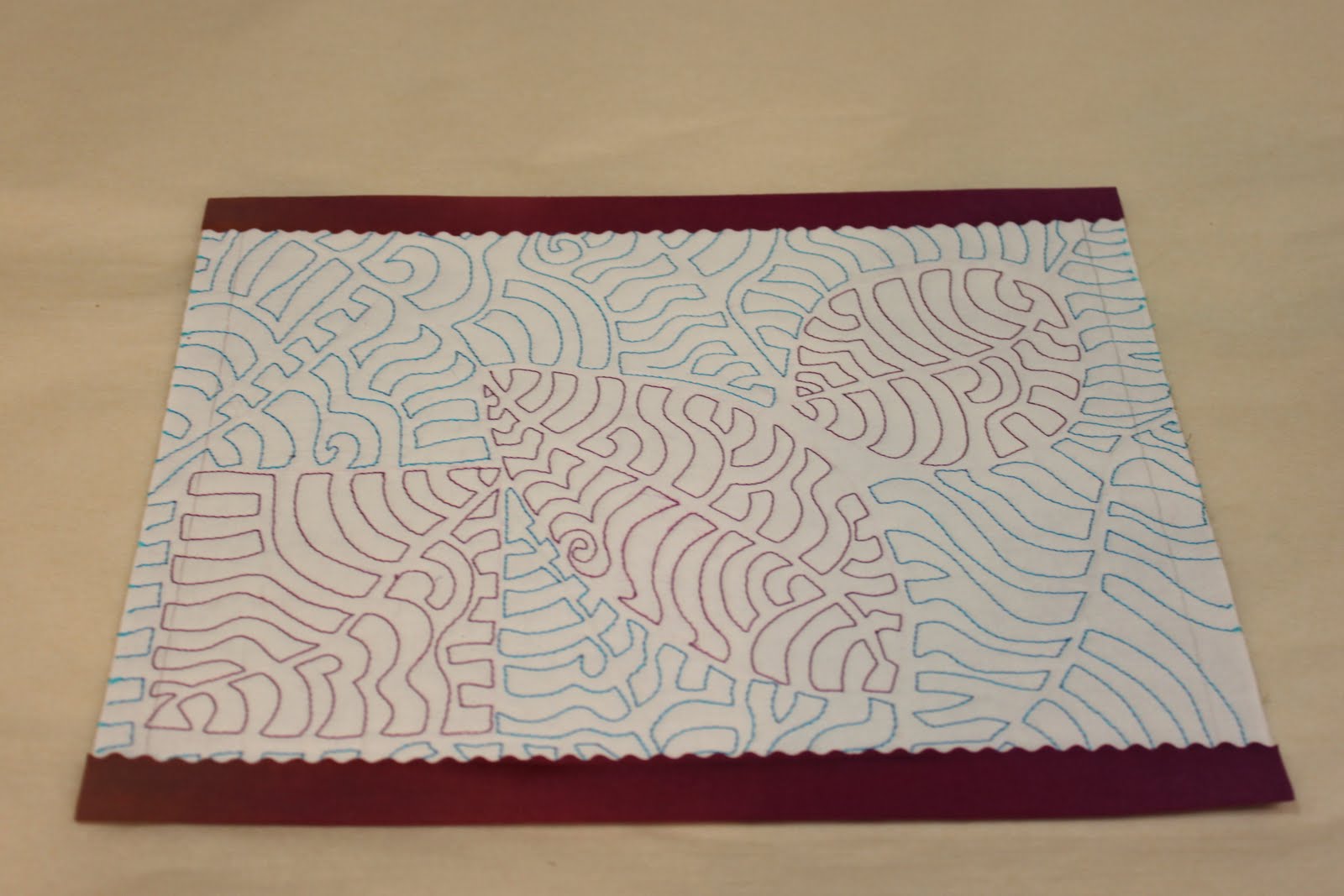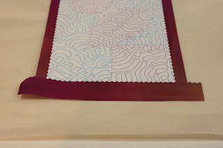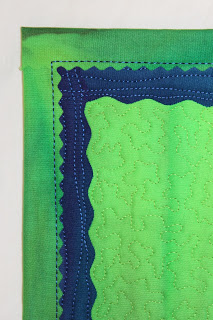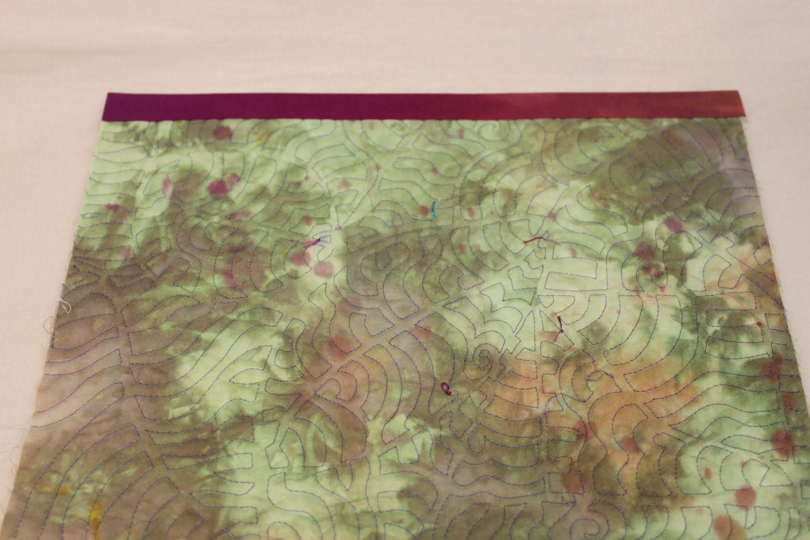 Most of my fused art quilts have this kind of binding. It is easy to do and really fast and it allows you to use those great decorative rotary blades in your rotary cutter to create one edge of the binding. It also allows you to use scraps of fused fabric if you want.