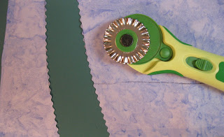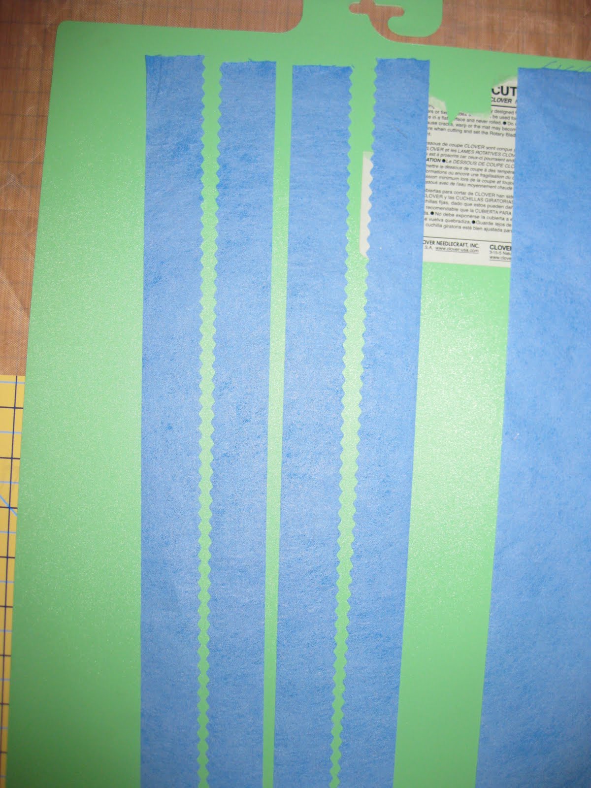 I use a straight blade and a decorative blade both in separate rotary handles to cut out the binding strips one right after the other in a row. When you are cutting with the decorative blades you want to turn your rotary mat over to the back side because these blades can scar your cutting mat. I keep all of my decorative blades in their own rotary handles that way they are ready to be used all the time. My favorite handle is this Frieda green one from Clover.