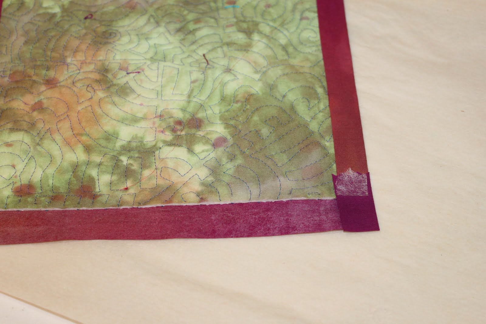 Once I have all the binding pieces cut out I place my quilt on my ironing surface with a piece of release paper under the edge of the quilt to begin the binding process. Release paper is the paper that comes off when you apply the fusible wonderunder #805 to the back of your fabric or if that rips a piece of parchment paper.