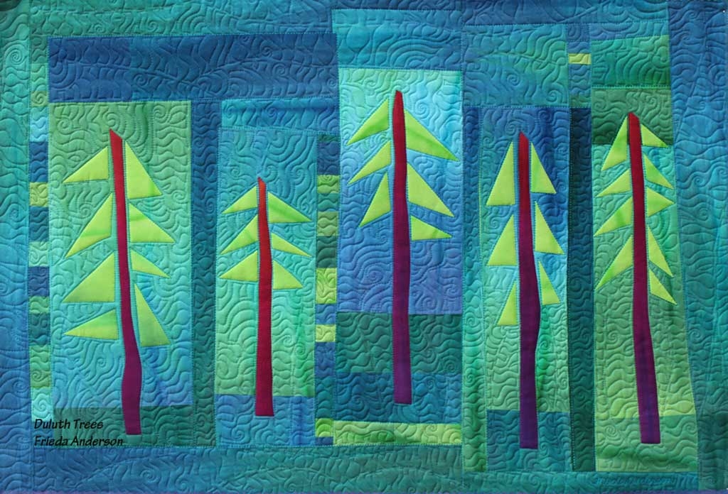 Raw -edge fusing makes quilting fun and fast. This woodland design is simple yet elegant and naturally suieted for quiet reflection of the passing seasons. Free form cut tree shapes and using a collage method fuse them onto fabric dyed in a colorway that speaks of cabins, lakes and rivers. Each student will create their own unique forest in the woods art quilt.